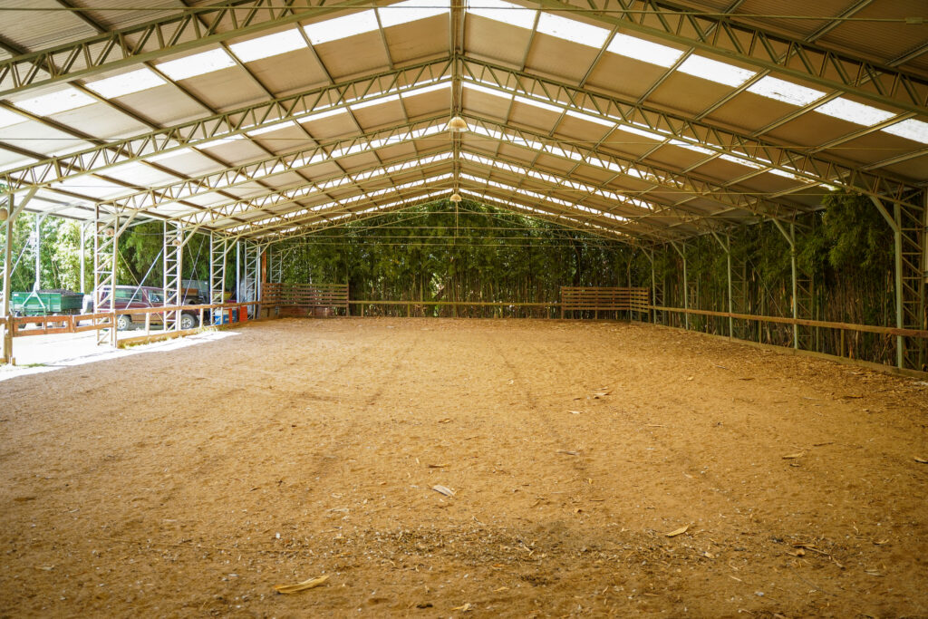 Our indoor arena covers 1,000 square meters, providing the ideal surface for playing polo on rainy days and during the winter season. The arena features two access doors, one of which is directly connected to the luxury indoor stables, allowing players and horses to move straight from the boxes to the arena without getting wet when it rains.
